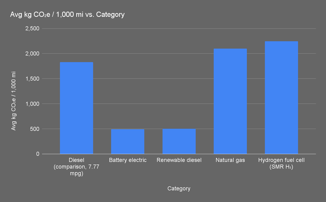 A diesel comparator helps floor the dialogue. At 7.77 mpg, which is a stage environment friendly fleets attain on freeway obligation cycles, diesel lands close to 1,830 kg CO2e per 1,000 miles and round $481 in vitality value at nationwide averages. That places renewable diesel with good feedstocks barely cleaner than diesel and barely dearer, and it leaves battery electrical clearly cleaner than each whereas additionally cheaper to gasoline in the identical areas. It additionally underlines how far pure fuel and steam methane reformer hydrogen sit from the mission while you current outcomes moderately than inputs.